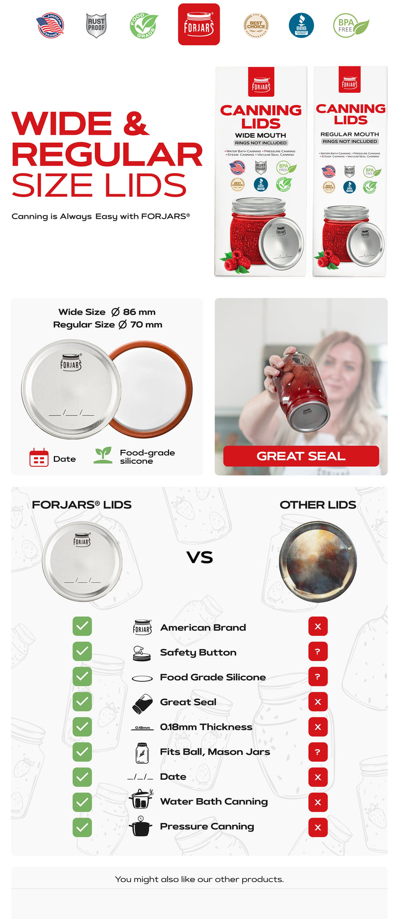 Safe for boiling and pressure cooking, these canning lids will provide dependable and safe seals for all your canning needs. From salsa, pickles, to turkey broth, these  Forjars Canning Lids are the affordable alternative you have been looking for all this time. Well search no more! Order today and discover for yourself why these canning lids are recommended by expert canners all over the USA.