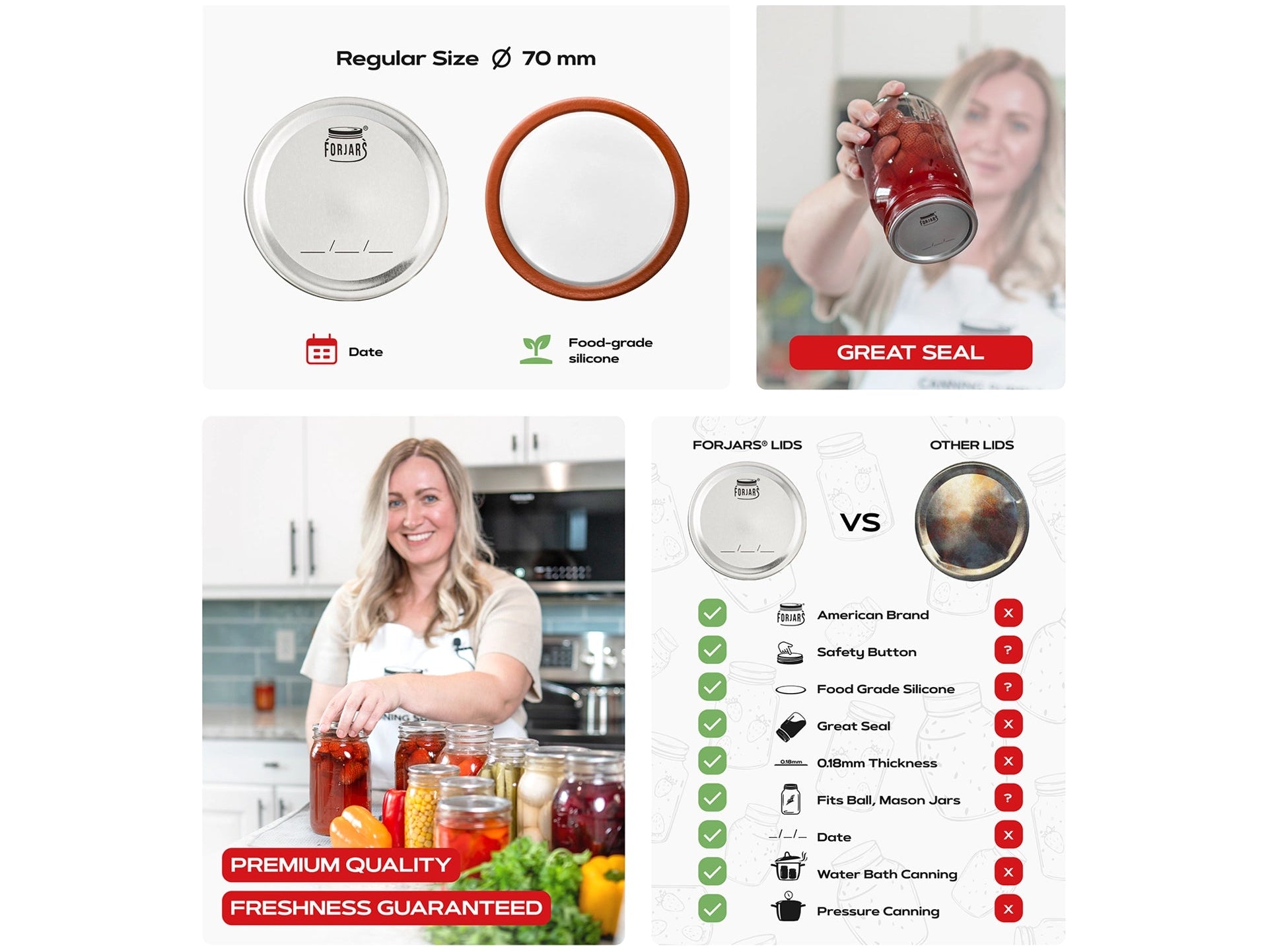 Forjars Canning Lids will hold a tight seal for up to 18 months, so you never have to lose any of the food you have canned. Built for regular and wide mouth ball jars, these airtight canning lids will offer you the best canning experience you’ve ever had. (Just check out all of our reviews below).