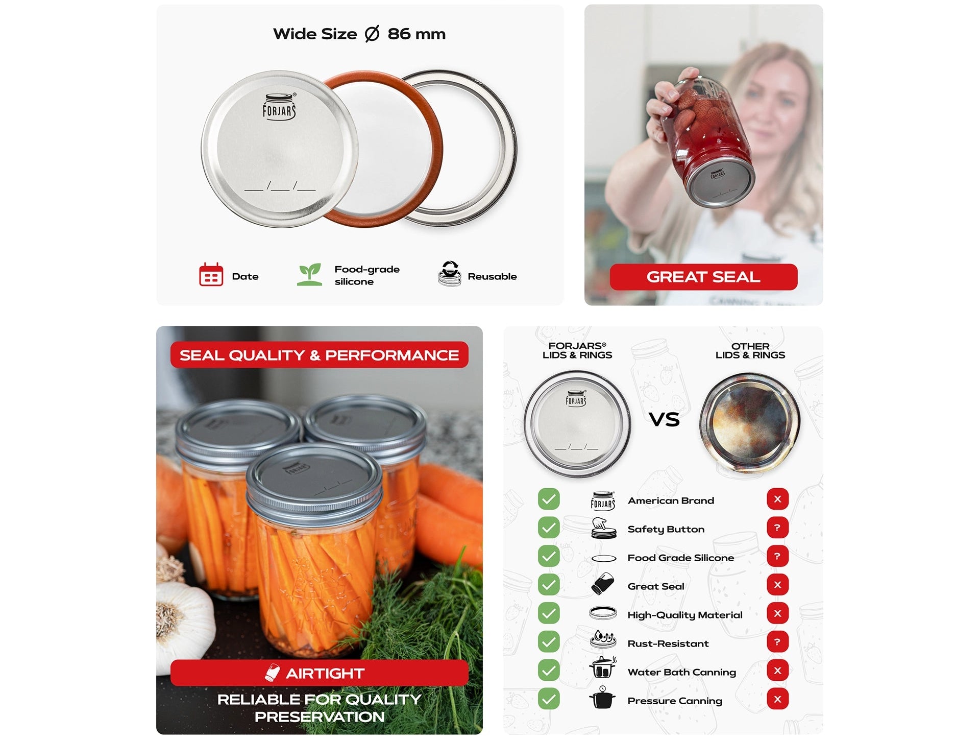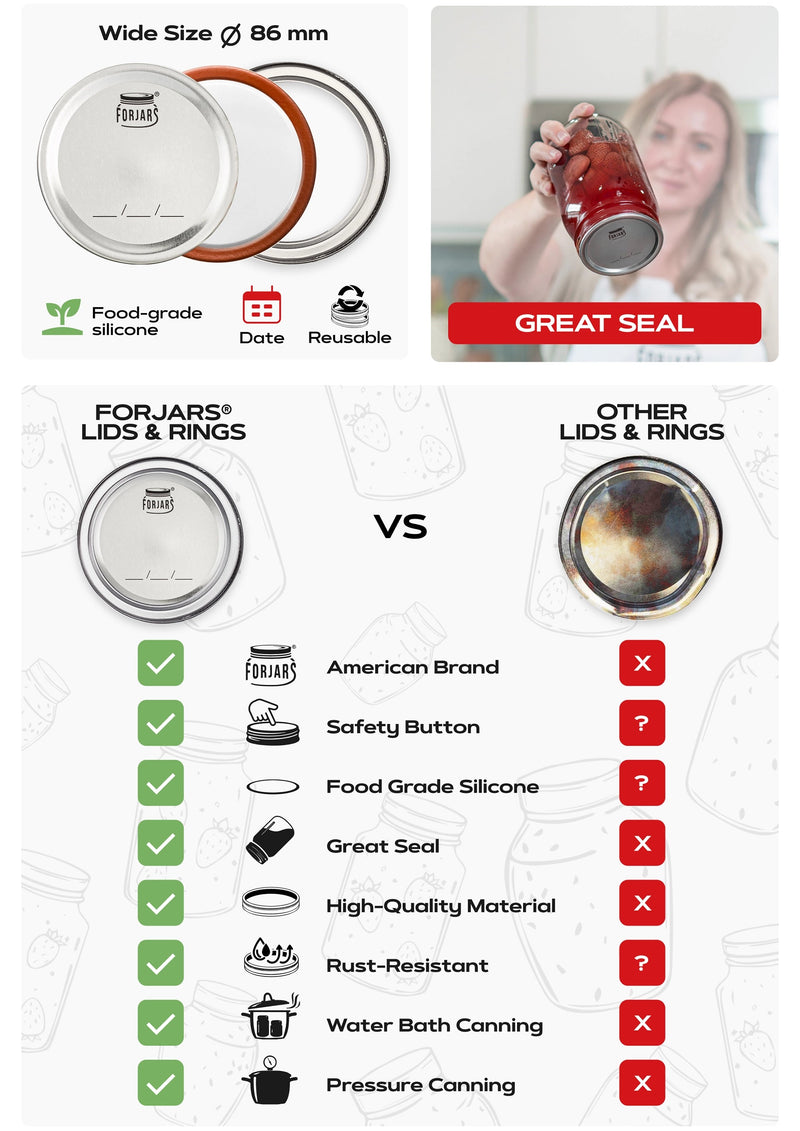 Safe for boiling and pressure cooking, these canning lids will provide dependable and safe seals for all your canning needs. From salsa, pickles, to turkey broth, these Forjars Canning Lids are the affordable alternative you have been looking for all this time. Well search no more! Order today and discover for yourself why these canning lids are recommended by expert canners all over the USA.