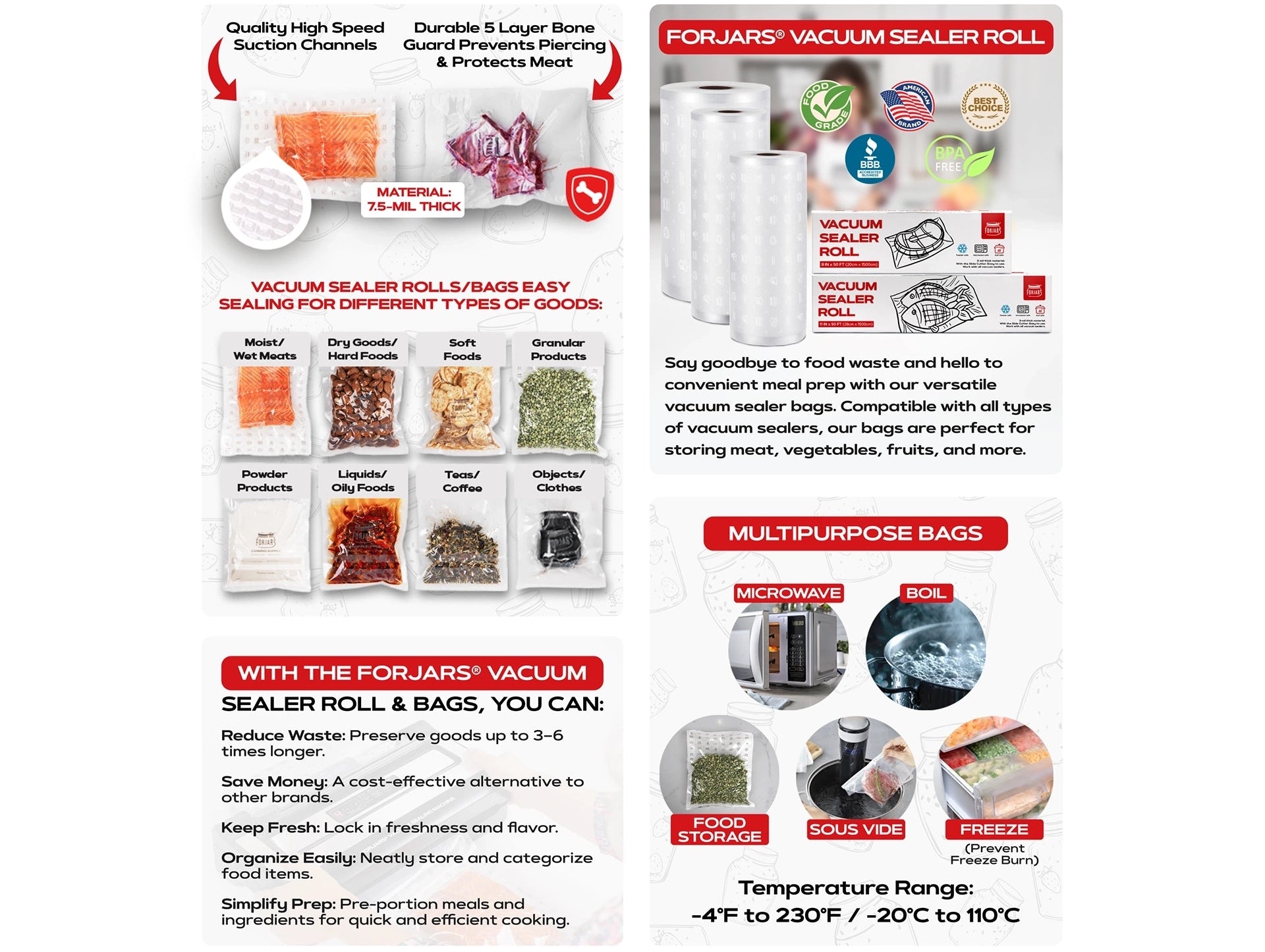 FORJARS® Vacuum Sealer Rolls - Now Textured on Both Sides for Maximum Efficiency